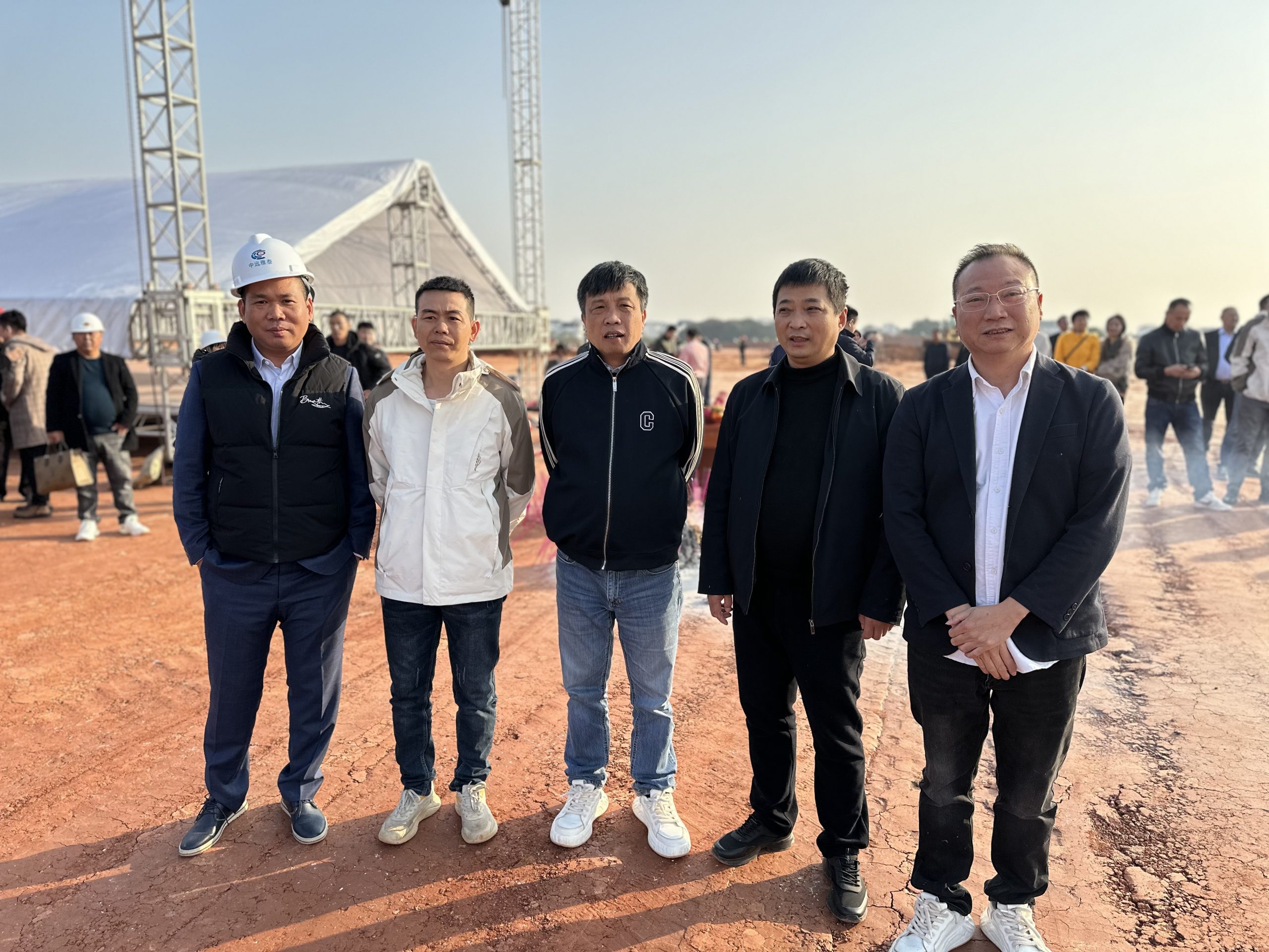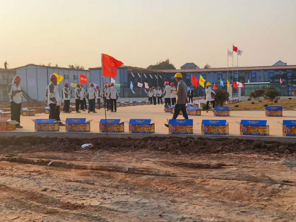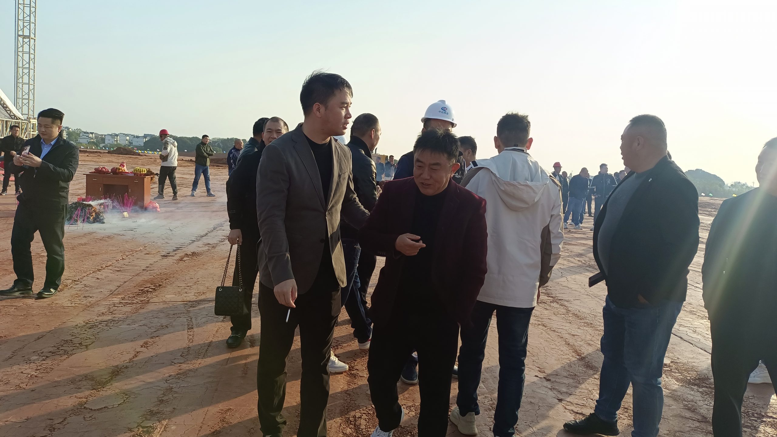 阳光照耀在宽敞的施工现场,金色的光芒洒在忙碌的工人们身上,为他们镀上了一层光辉。鲜艳的旗帜在风中飘扬,仿佛在为这个重要的时刻喝彩。典礼的现场布置得庄重而热烈,每一个细节都充满了期待与喜悦。