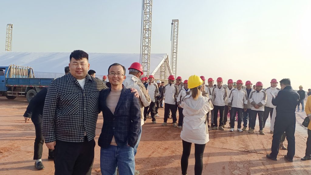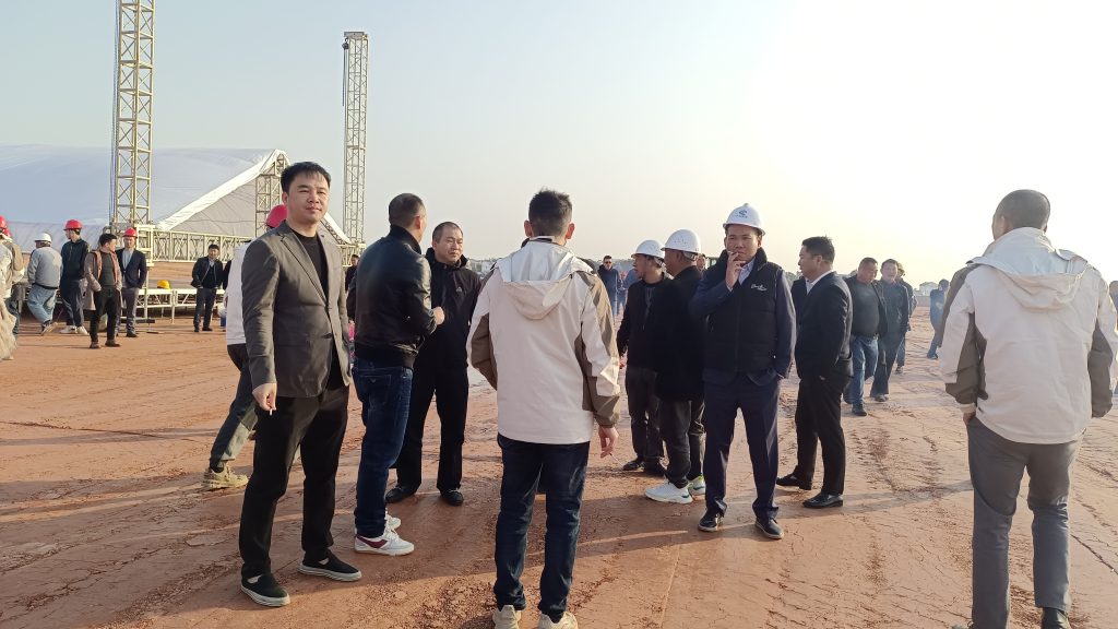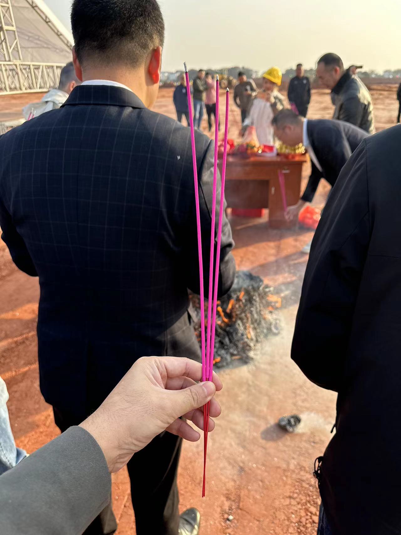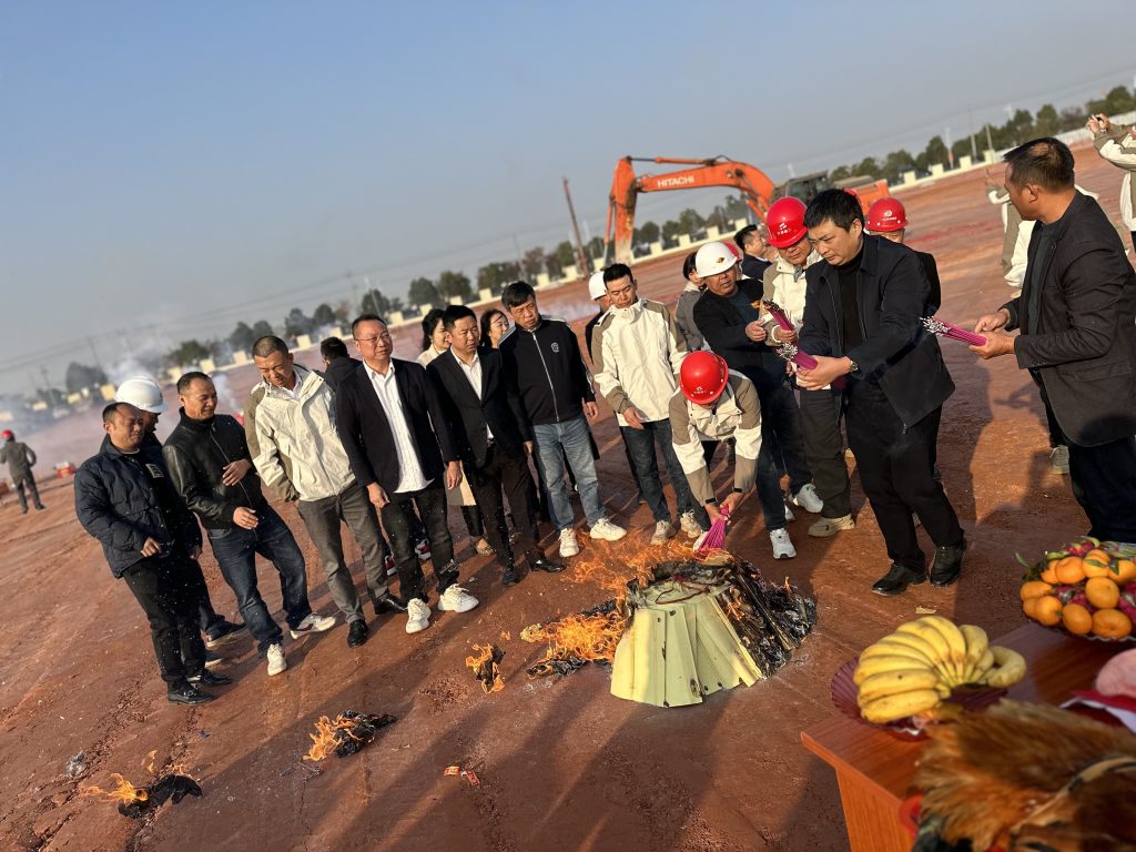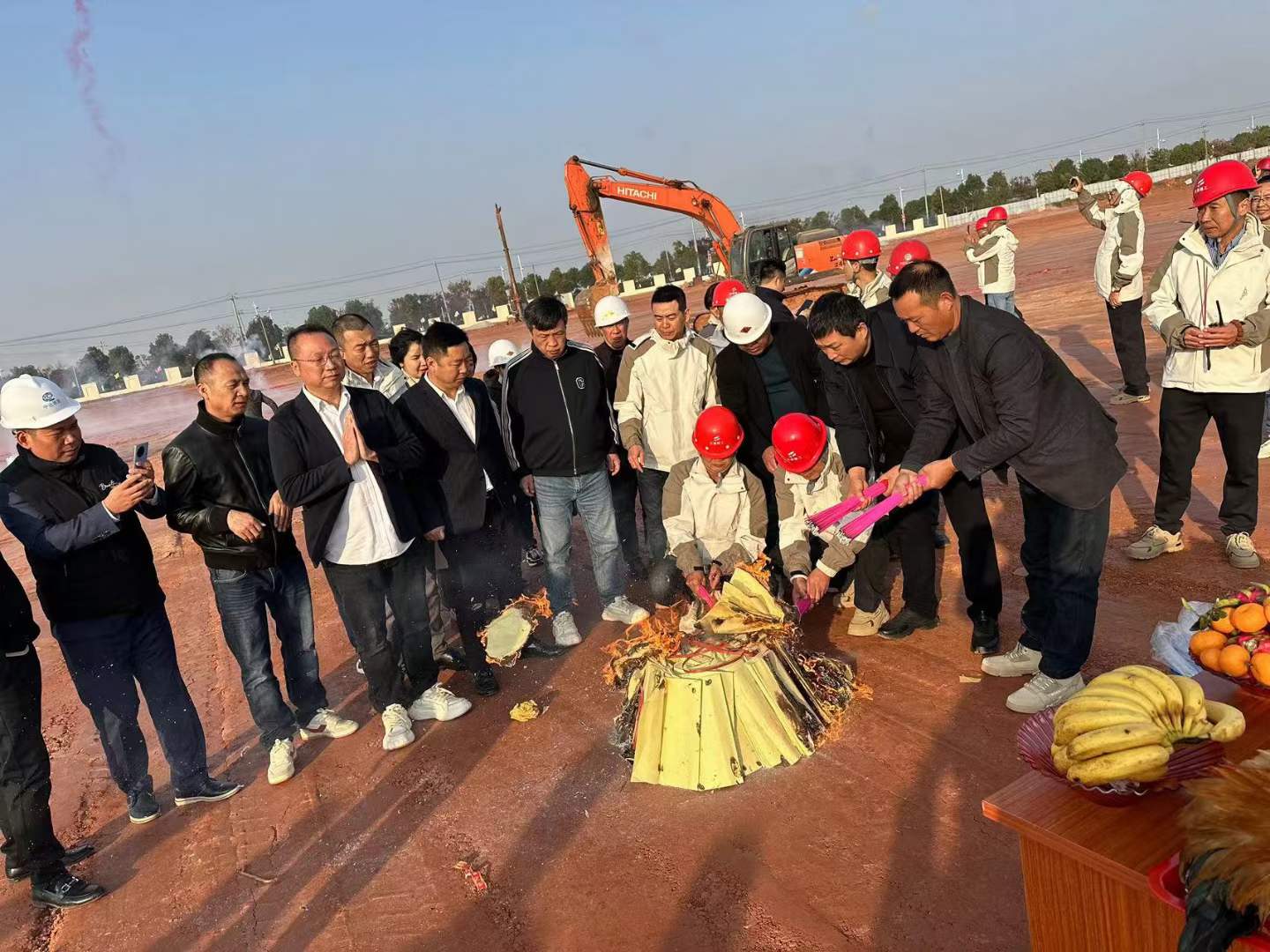 阳光照耀在宽敞的施工现场,金色的光芒洒在忙碌的工人们身上,为他们镀上了一层光辉。鲜艳的旗帜在风中飘扬,仿佛在为这个重要的时刻喝彩。典礼的现场布置得庄重而热烈,每一个细节都充满了期待与喜悦。